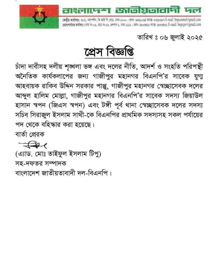 চাঁদা দাবী, দলীয় শৃঙ্খলা ভঙ্গ এবং নীতি-আদর্শ ও সংহতির পরিপন্থী অনৈতিক কর্মকাণ্ডে জড়িত থাকার অভিযোগে গাজীপুর মহানগর বিএনপি ও এর সহযোগী সংগঠনের চার নেতাকে দল থেকে বহিষ্কার করেছে বাংলাদেশ জাতীয়তাবাদী দল (বিএনপি)।
