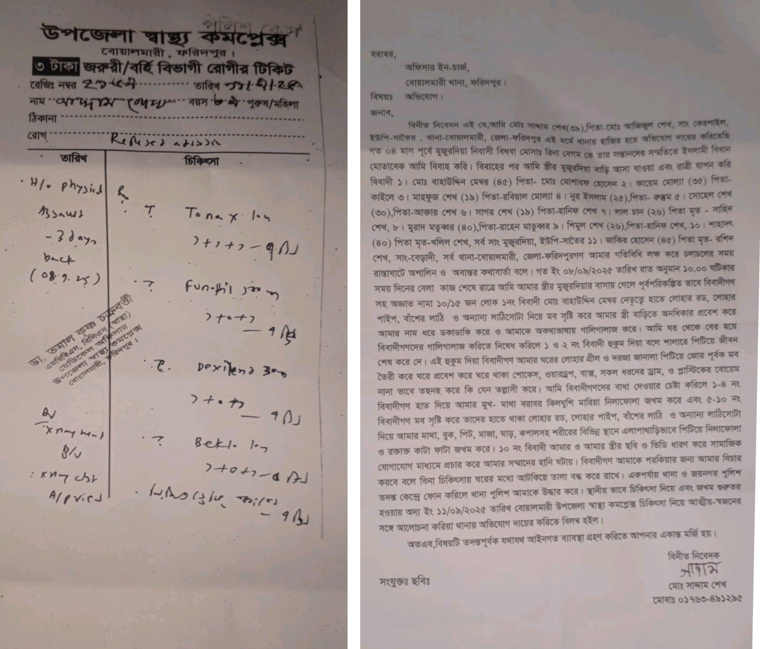 ফরিদপুর জেলার বোয়ালমারী উপজেলার সাতৈর ইউনিয়নের ৩ নং ওয়ার্ড মেম্বার বাহাউদ্দীনের নেতৃত্বে স্বামী স্ত্রীকে মারধর প্রশাসনের অনুমতি ছাড়া নিজেরা ঘর তল্লাশি করা এবং ভিডিও করে সামাজিক যোগাযোগ ফেসবুকে দিয়ে তাদের মানহানিকর করার অভিযোগ পাওয়া গেছে। বোয়ালমারী থানায় অভিযোগ দায়ের করেন একই ইউনিয়নের কেশরাইল গ্রামের আজিজুল শেখের ছেলে সাদ্দাম শেখ (৩৯)। তিনি বলেন, আমি মুজুরদিয়া গ্রামের বিধবা রিনা বেগমকে ইসলামী শরীয়হ্ মোতাবেক গত চার মাস পূর্বে বিবাহ করি। সেই সূত্রে আমি আমার স্ত্রীর বাড়িতে যাওয়া আসা করি। গত ৮ সেপ্টেম্বর রাত দশটার দিকে কাজ শেষ করে আমি আমার স্ত্রী রিনা বেগমের মজুরদিয়ায় বাসায় গেলে পূর্ব পরিকল্পিত ভাবে ওৎ পেতে থাকা বাহাউদ্দিন মেম্বারসহ তার নেতৃত্বে মুজুরদিয়া গ্রামের কায়েম মোল্লা, মাহফুজ শেখ,নুর ইসলাম, সোহেল শেখ,সাগর শেখ,লাল চান,মুরাদ মাতুব্বর, শিমুল শেখ, শাহাদাৎ শেখ ও বেড়াদী গ্রামের জাকির হোসেনের নাম উল্লেখ করে আরও অজ্ঞাত ১০/১৫ জনের নামসহ থানায় একটি অভিযোগ দায়ের করেন। তিনি অভিযোগে আরও উল্লেখ করেন,বাহাউদ্দীন মেম্বারের নেতৃত্বে অভিযুক্ত ১১ জন আসামি ছাড়াও ১০/১৫ জনের হাতে থাকা লোহার রড,লোহার পাইপ,বাঁশের লাঠি ও অনান্য লাঠি সোটা নিয়ে মব সৃষ্টি করে আমার নাম ধরে ডাকাডাকি এবং অকথ্য ভাষায় গালিগালাজ করে। আমি এবং আমার স্ত্রী ঘর থেকে বেরিয়ে এসে গালিগালাজ করতে নিষেধ করলে আসামিরা আমার মাথা,বুক,পিঠ,মাজা,ঘাড়,কপালসহ বিভিন্ন স্থানে নিলাফোলা ও রক্তাক্ত জখম করে। আমি নিরুপায় হয়ে বোয়ালমারী থানা ও জয়নগর ফাঁড়িতে ফোন দিলে পুলিশ আমাদের উদ্ধার করে। সাদ্দাম আরও বলেন, রাতে কোথাও যেন পালিয়ে না যাই সেজন্য মব সৃষ্টি করে আমার ঘরের গেটে তালা দিয়ে রাখে। পরের দিন ৯ সেপ্টেম্বর বেলা ১০ টার দিকে নিজেরা গেটের তালা খুলে আমার ঘরে অনধিকার প্রবেশ করিয়া ঘরে থাকা শোকেস,ওয়ারড্রব, বাক্সে, সকল ধরনের ড্রাম,প্লাস্টিকের বোয়াম, খাটের উপর নীচে এলোপাতাড়ি কি যেন খুঁজাখুঁজি করে। কিছু না পেয়ে আমাকে পরকিয়ার বিচার করবে বলে শালিশ বসায় নিজেরা। আমার বিবাহিত বৈধ স্ত্রী হওয়ার জন্য কিছু করতে না পেরে আমাকে ও আমার স্ত্রীকে গ্রাম ছাড়া করে দেন। স্থানীয়ভাবে আমি চিকিৎসা নেই যখম গুরুতর হওয়ার জন্য ১১ সেপ্টেম্বর বোয়ালমারী উপজেলা স্বাস্থ্য কমপ্লেক্সে চিকিৎসা নেই।